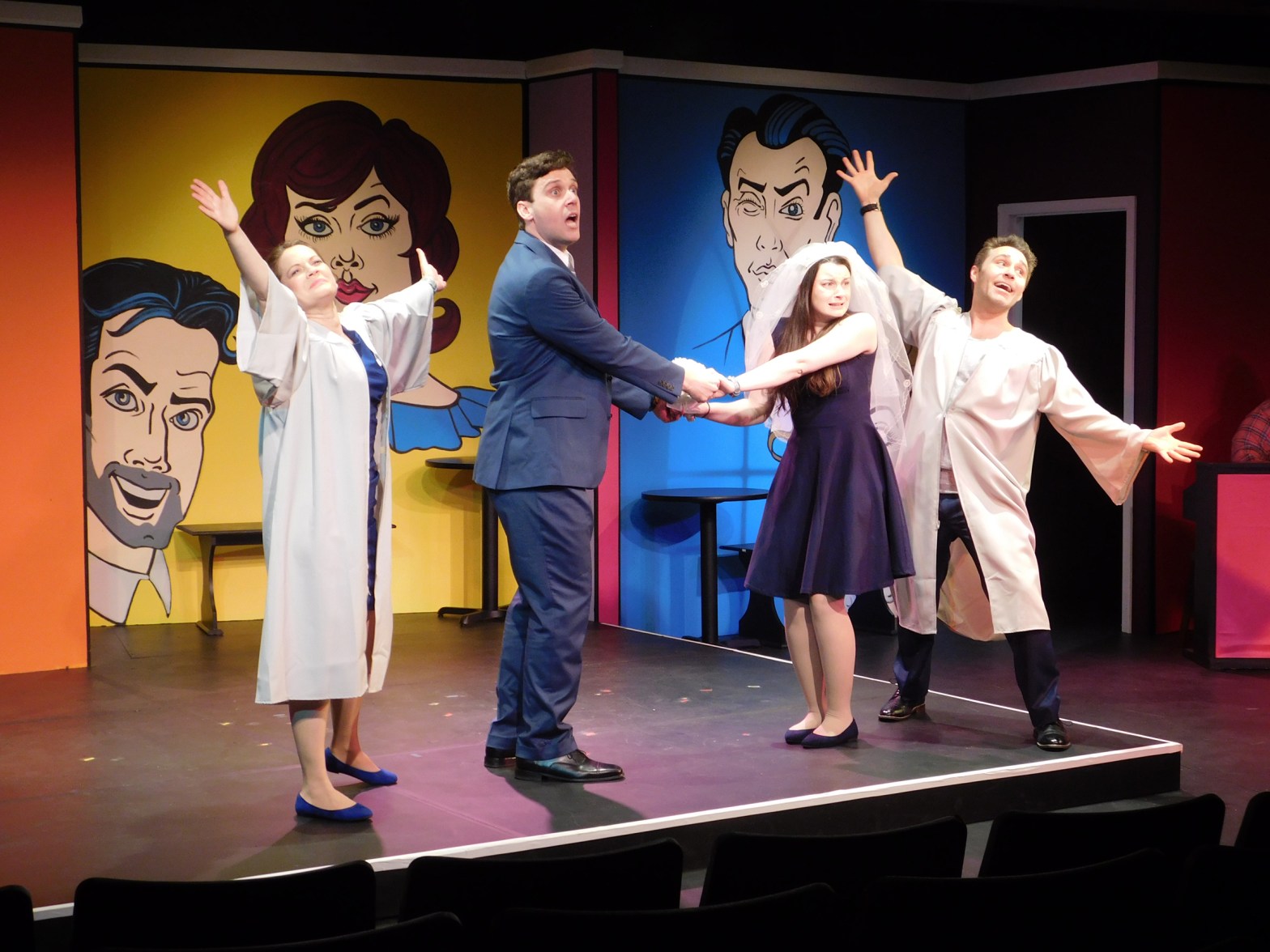 In the two act, two hour play, four actors play a myriad of characters with simple but effective changing of costumes and makeup. The four are brilliant in their portrayals that begin with a first date. In another, a couple is telling the parents they are breaking up just as the parents are expecting to hear that the kids might be getting married. One of my favorites was a car ride with the kids as choreographer Dann Dunn staged the family in four chairs and moved them all over the stage in a crazy but uproarious fashion.