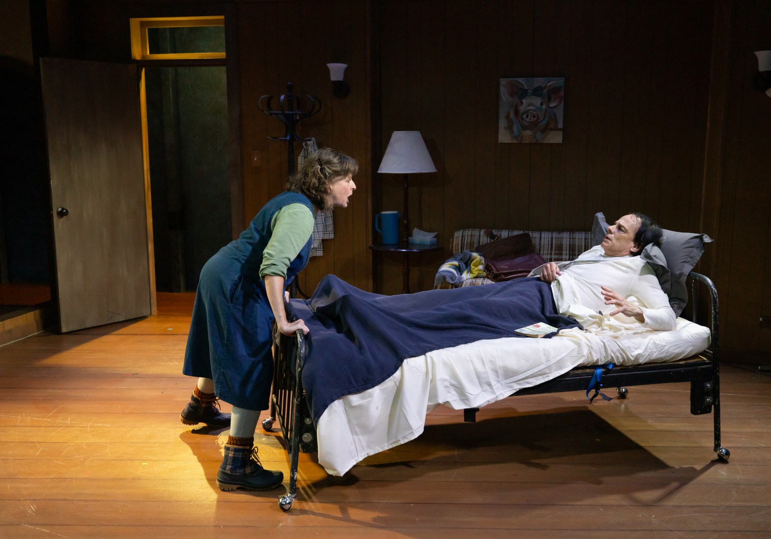 It begins in the living room of the Colorado cabin of Annie Wilkes (Sabrina Profitt) where we find successful romance novelist Paul Sheldon (Christopher Patrick Mullen) in a hospital type bed, bandaged and with braces. He has just crashed on the snowy roads outside the town and Annie has rescued him. Annie was a nurse and has everything the victim needs. and brought him to her cabin. The road to the hospital was snow-covered, but fortunately, Annie has the tools and the medicines to care from him.